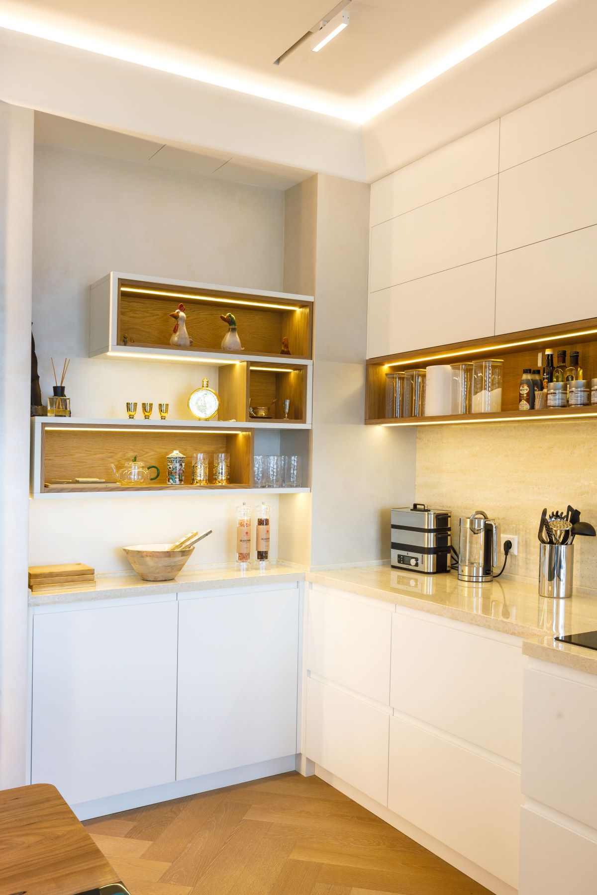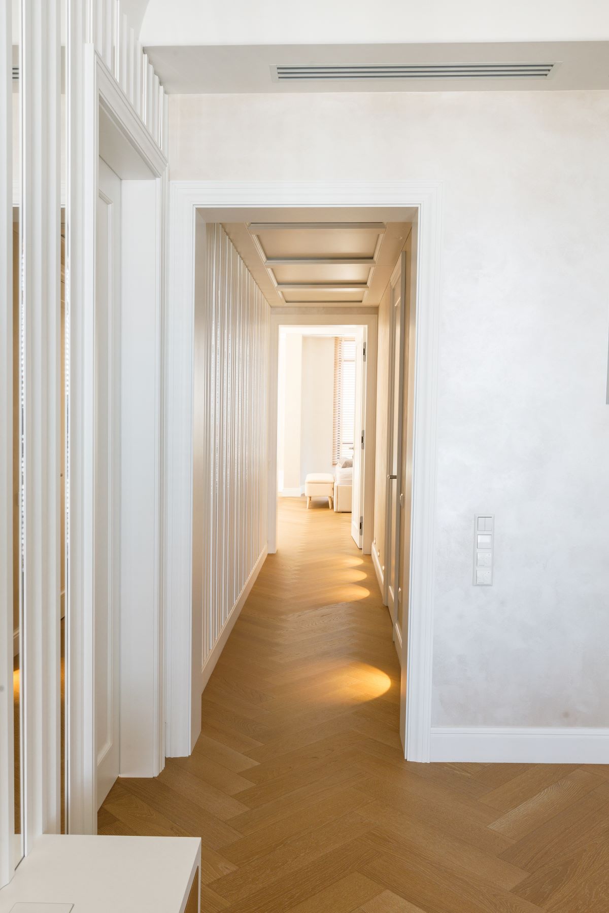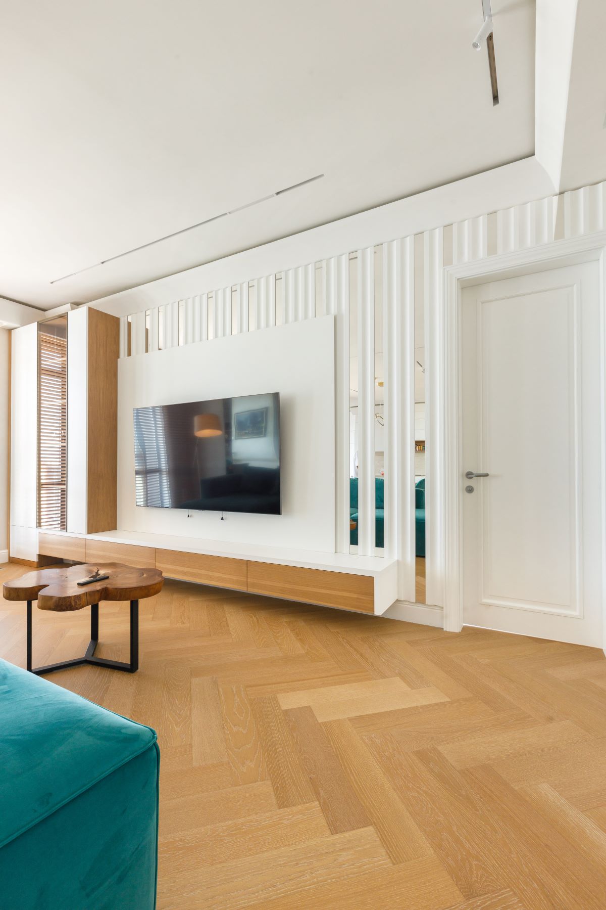 Чистота белого и геометрия линий смягчаются деревом и мягким матовым текстилем.