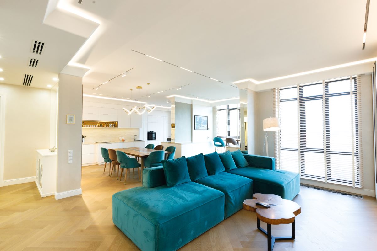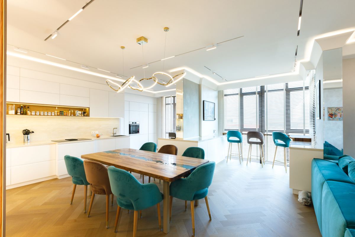 Гармоничный интерьер, наполненный прямыми линиями и световыми акцентами, украшает мебель насыщенного бирюзового цвета.