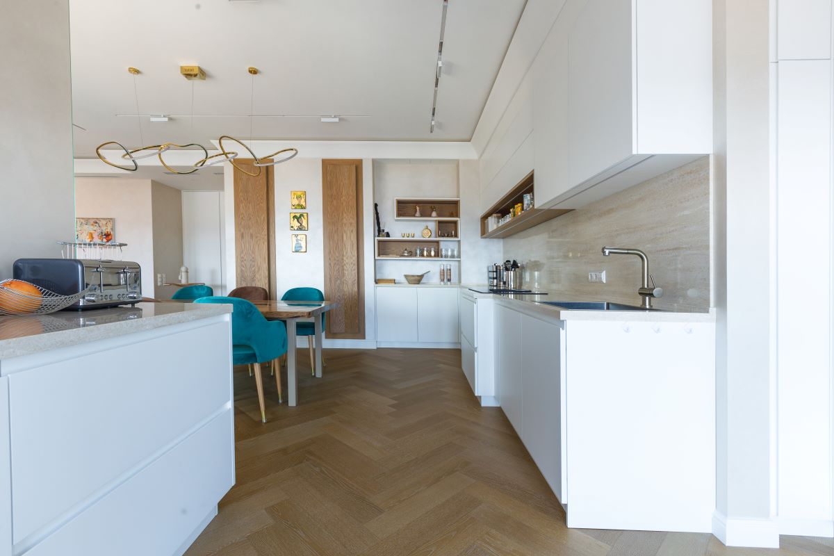Квартира буквально светится: здесь много солнечного света благодаря окнам в пол и много локальных источников света. Это работает на создание разной атмосферы дома.