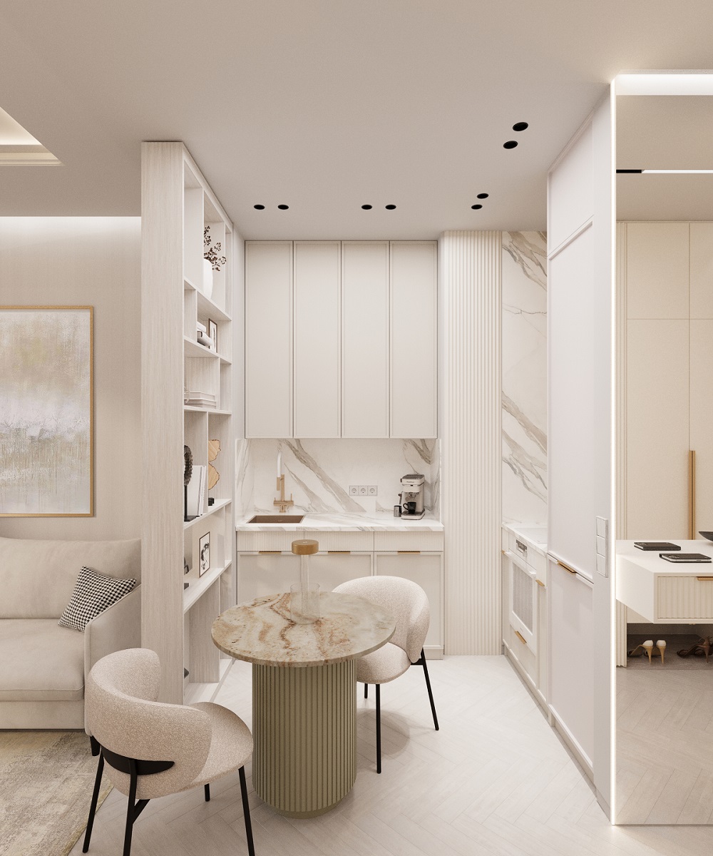 Интерьер в ЖК Will Tower — воплощение легкости и современной элегантности. Обилие белого цвета делает пространство светлым и воздушным, а панорамные окна в пол наполняют его естественным светом в течение всего дня. Натуральные фактуры дополняют атмосферу уюта: на полу — кварцевый паркет в оттенке "Дуб Песочный", который идеально сочетается с благородным мрамором, украшающим отдельные элементы интерьера.